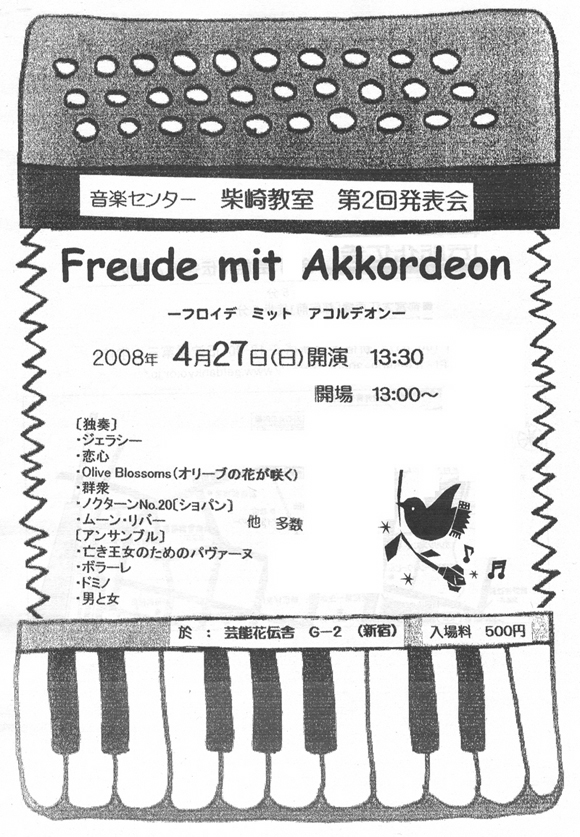 でも、アコーディオンの演奏を聴きに行くと、最初は指さばきをチェックしたりするんですが、すぐに音楽にうっとりしてしまって、指をみるのは忘れちゃうんですよね私。(非研究熱心?)